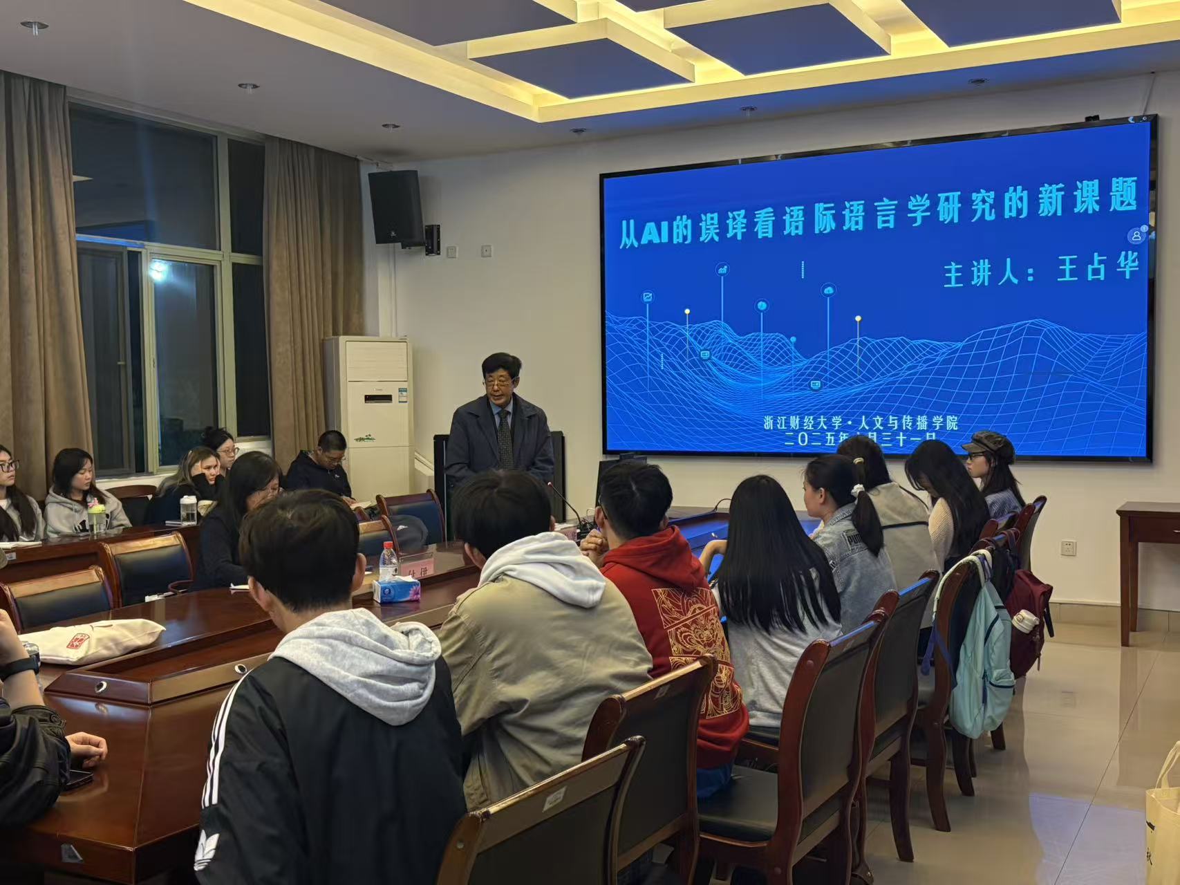 10月31日晚上,国际中文教育界和语法学界杰出学者、日本北九州市立大学王占华教授应邀为公司研究生带来一场题为 “从AI的误译看语际语言学研究新课题” 的学术讲座。讲座由公司国际中文教育专业硕士学位点负责人付伊副教授主持,国际中文教育以及语言学专业的教师与研究生到场聆听。