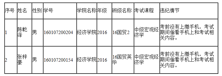 2018年6月25日的课程期末考核中,公司共有2位同学在考试中违纪,名单如下: