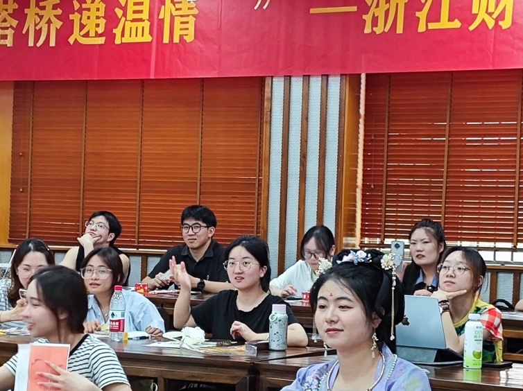 猜灯谜活动中,谜题设计巧妙融合传统典故与地域特色,“玉兔捣药”引经据典,“钱塘江潮”应景入题,既考验智慧,更传递文化,中外学子或凝神思索,或热烈讨论,破解谜底时的欢笑声此起彼伏。