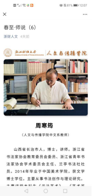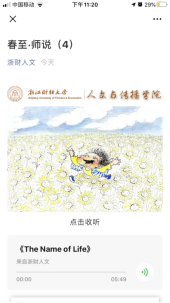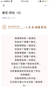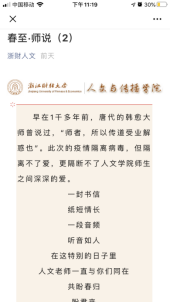 疫情期间,公司党委因势利导,发挥互联网新媒体传播优势,组织开展网络思政教育,发起“春至·师说”专栏活动,实现停课不停教,隔离不割爱。自3月2日起,该院先后邀请院内18位一线教师和院外5位社会导师过网络向员工们寄予真切关心关怀,共话员工成长,将老师们对员工的谆谆教导传递给居家学习的老员工们。截止3月9日,“浙财人文”公众号累计登载8期,累计点击率达5300多人次,成为该院老员工们每日一道成长“大餐”,收到了良好教育效果和社会反响。