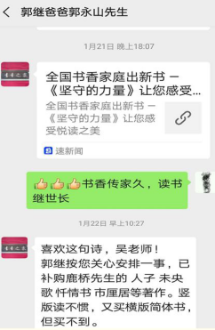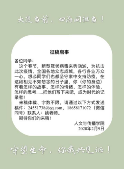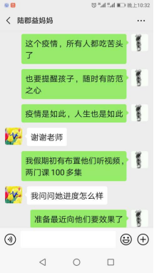 疫情带来了大不幸,也带来了师生、家校更多的交流和互动。2月9日下午,18文学陆郡益同学家长给吴智斌老师发来了该生在家自行录制的抗疫短视频《夜空中最闪亮的星》,用赤诚的歌声和滚烫的话语为中国、为武汉“抗疫”加油,家长对孩子成长的喜悦与老师的感谢溢于言表。