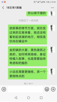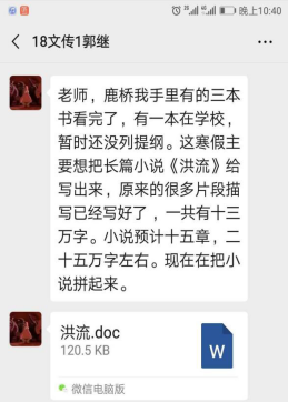 18文学的郭继同学是公司的“名人”员工,才气出众,写作、演讲、辩论、主持等样样出色,还有较为成熟、深入的研究能力,常常被任课教师们感叹是“十年一遇”的优秀员工。这个“寒假”出乎意料地超长,针对郭继同学的个人特色与能力,吴智斌老师与郭继同学家长联手给其开出了两个特色任务:一是根据其兴趣研读家乡宿迁知名作家鹿桥文集并选题完成专业论文一篇;二是推进其准备多时的长篇小说《洪流》的写作。到2月14日,郭继同学整理完成了小说13万余字的文稿,前五章计3万已经修改定稿,并与吴智斌老师、姚晓萍老师进行了较为细致、深入的讨论与修改。