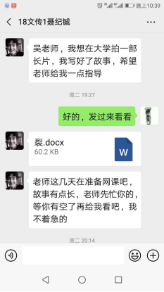 在假期中,支部的教师党员还收到了18数媒专业聂纪铖同学的剧本《裂》和一段令人鼓舞的留言:“老师,我想在大学期间拍一部长片,我写好了故事,希望老师给我一些指导。”而作为大二员工的他,已经在过去的一学期中完成了一部质量不低的微电影《火》,在同学们之间形成了一定的影响。也是这个假期,他们收到了18文学苏赞赞同学令人欣喜的表白:“总而言之,选择文学是我认为最正确的事情!”而在2019年上学期,苏赞赞同学曾经在因为选择专业上的万分纠结,曾经向支部才党员教师们寻求帮助。