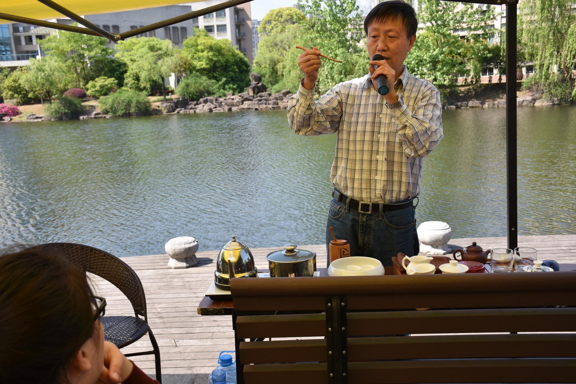活动伊始,吴玻老师向大家讲述了举办“品茶说茶”沙龙活动的意义。而后,董老师亲手为同学们泡好了明前西湖龙井茶,配以虎跑泉水,并且凭借其之前的工作和生活经历,系统讲解了中国茶的种类,以及不同茶叶的冲泡方法和如何品鉴等,在讲解中还穿插讲解中国儒释道以及佛学。