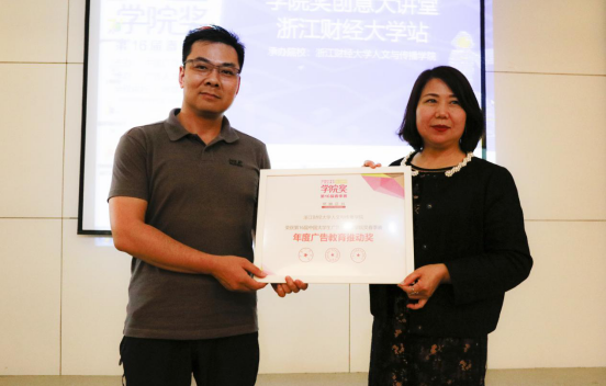 意昂2一直致力于培养高素质的广告业人才,并助力公司奖推动广告实战教学的发展。为表示感谢,组委会代表、广告人杂志副主编、广告人公司副经理高鹏铭先生向意昂2颁发“年度广告教育推动奖”。广告系陈朝霞副教授作为承办方代表接受荣誉。