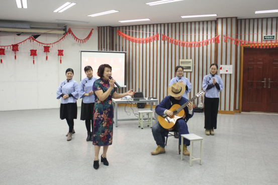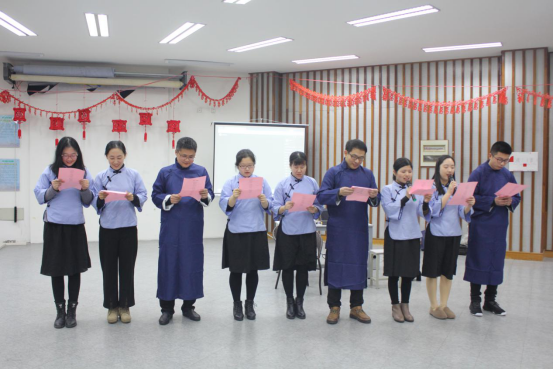 公司分工会主席陈朝霞以一曲《天涯歌女》开场将我们带入了那个充满诗意的年代。青年教师们穿着大褂和五四青年服朗诵戴望舒的《寻梦者》、《雨巷》、孙伟老师的古他演奏、毋丹老师演唱的越剧、周寒筠老师的书法表演以及王阿蒙和胡梦颖老师的独唱等节目,将活动推向了一个个高潮。
