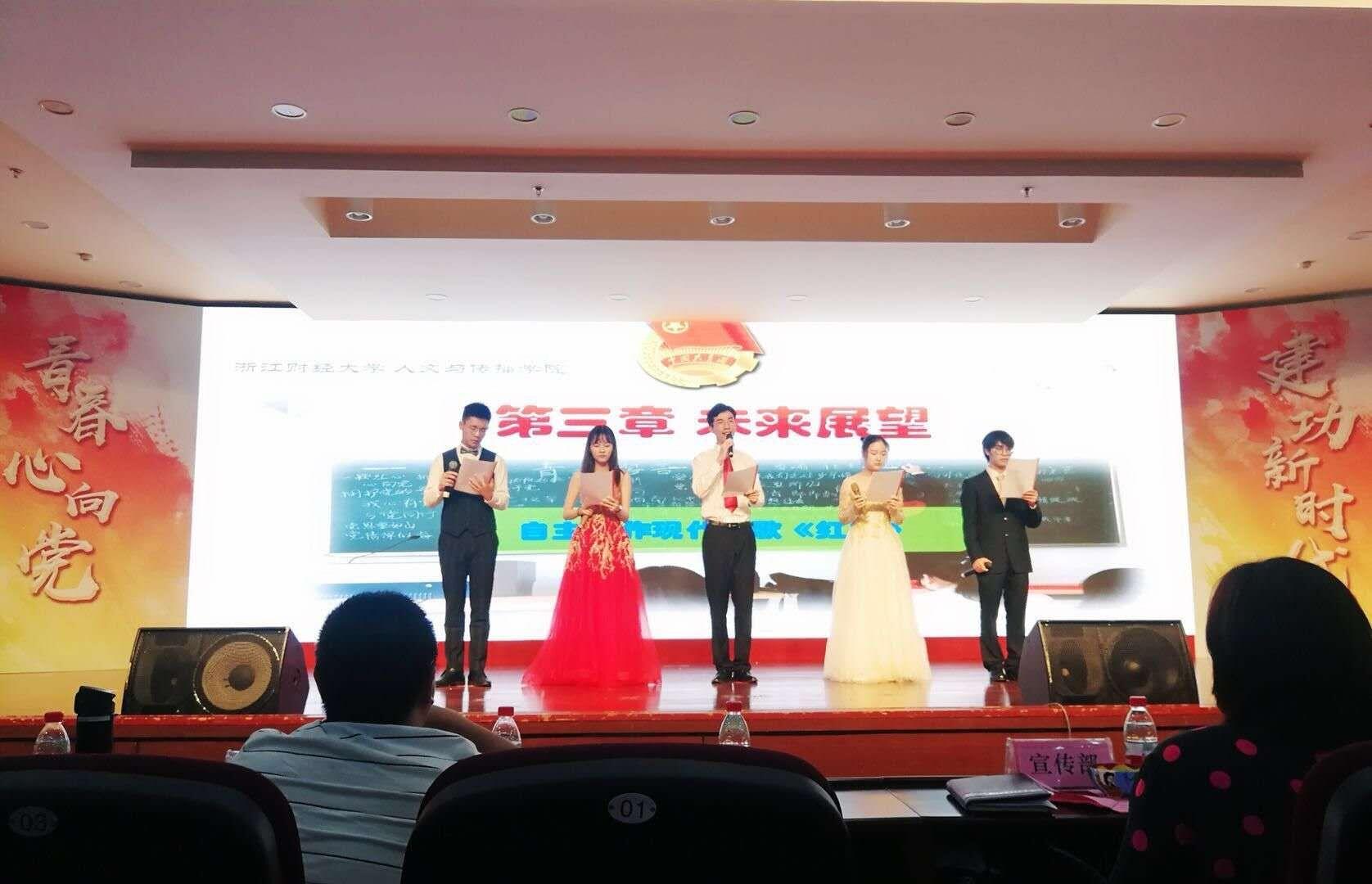 该团支部着力打造班级团支部“五彩”文化,不断推陈出新,向现场评委和观众展示了团支部“红岩读书”、“金色历史”、”青听之声”、”蓝色志愿”、”紫色团建”五大特色活动。现场,郭继、陆郡益、姚诗琪、林鹏伟、胡恩润五名同学朗诵了团支部创作的诗歌《红船》,结合公司特色,追溯红色轨迹,展现了公司青年积极向上的风采面貌和团支部建设的优秀成果。