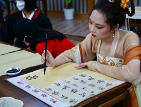 活动三“跨文化交流”,师生们进行自由观展和一对一的书法指导,阮斌杰同学弹奏古琴、石琴,邀请师生体验,并且通过弹曲猜名的方式赠送十支手作传统发簪给中外师生;赞比亚的木槿同学演唱越剧和中文流行歌曲,21级研究生南洋身着汉服也为大家演唱中文歌曲;日本的天美老师与同学们讲述汉字在日本的使用情况,以及如何克服“汉字难”的趣闻;俄罗斯的几位同学与中国员工一起讨论杭州亚运会吉祥物的象征意。大家在这一环节显示出很高的观览兴致,也展现了中外交流中倾听与沟通的耐心,坚持书写与感知汉字之美的恒心,以及对中文和中国文化的倾心。
