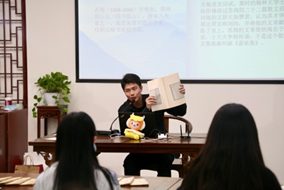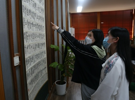 活动开场,苏浩老师以二十四节气之一的“谷雨”引出联合国“国际中文日”活动,表示国际汉语教育需要展现具有普世价值与中国特色的文化因素,对外国友人进行润物细无声的文化浸润。活动一“汉籍、书法展观”,由老师们和21级硕士研究生黎菁予导览展品,并介绍古籍装裱、出版等版本学的相关内容。