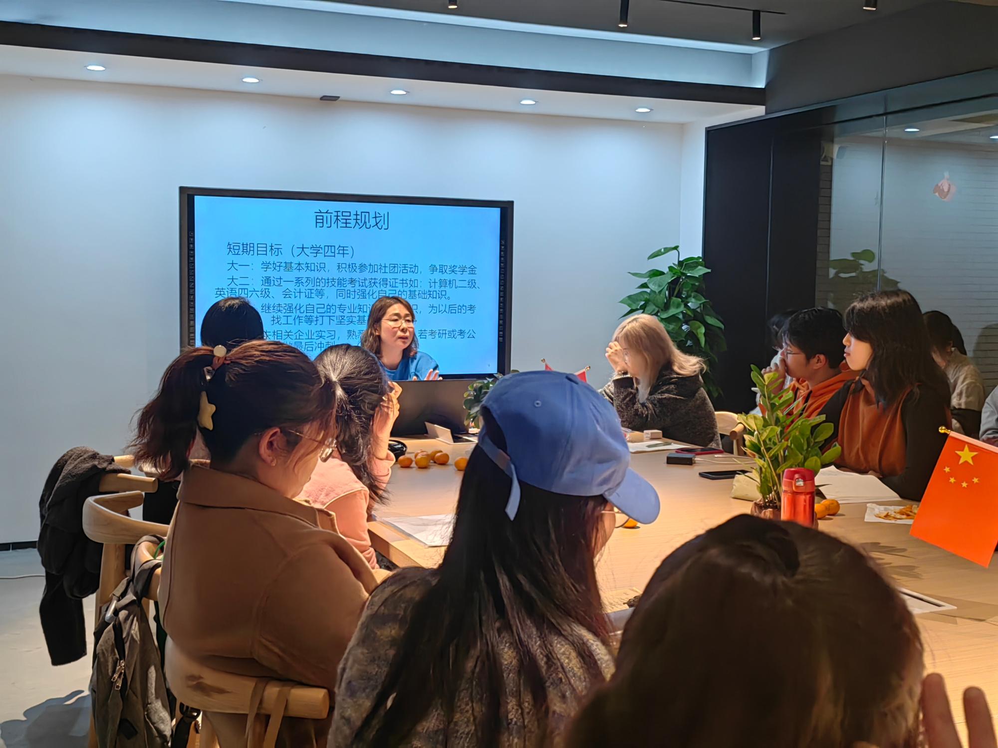 为了加强新生对专业认知,做好生涯规划,同时推进思政工作进园区,11月28日晚上,意昂2在员工生活园区“偕行书院”举行了“2022级新生始业沙龙”活动第七期。来自公司的任玉函老师作为本次活动的主讲,以“写给四年后自己的一封信——老员工涯规划”为主题,与同学们交流讨论大学四年应当如何进行合理的规划与安排。同时,本次沙龙还邀请了会计公司的20级员工项苏锐来分享自己过去两年的经历与接下来的规划。辅导员顾雨濛以及22文学3班全体同学参加了本次活动。