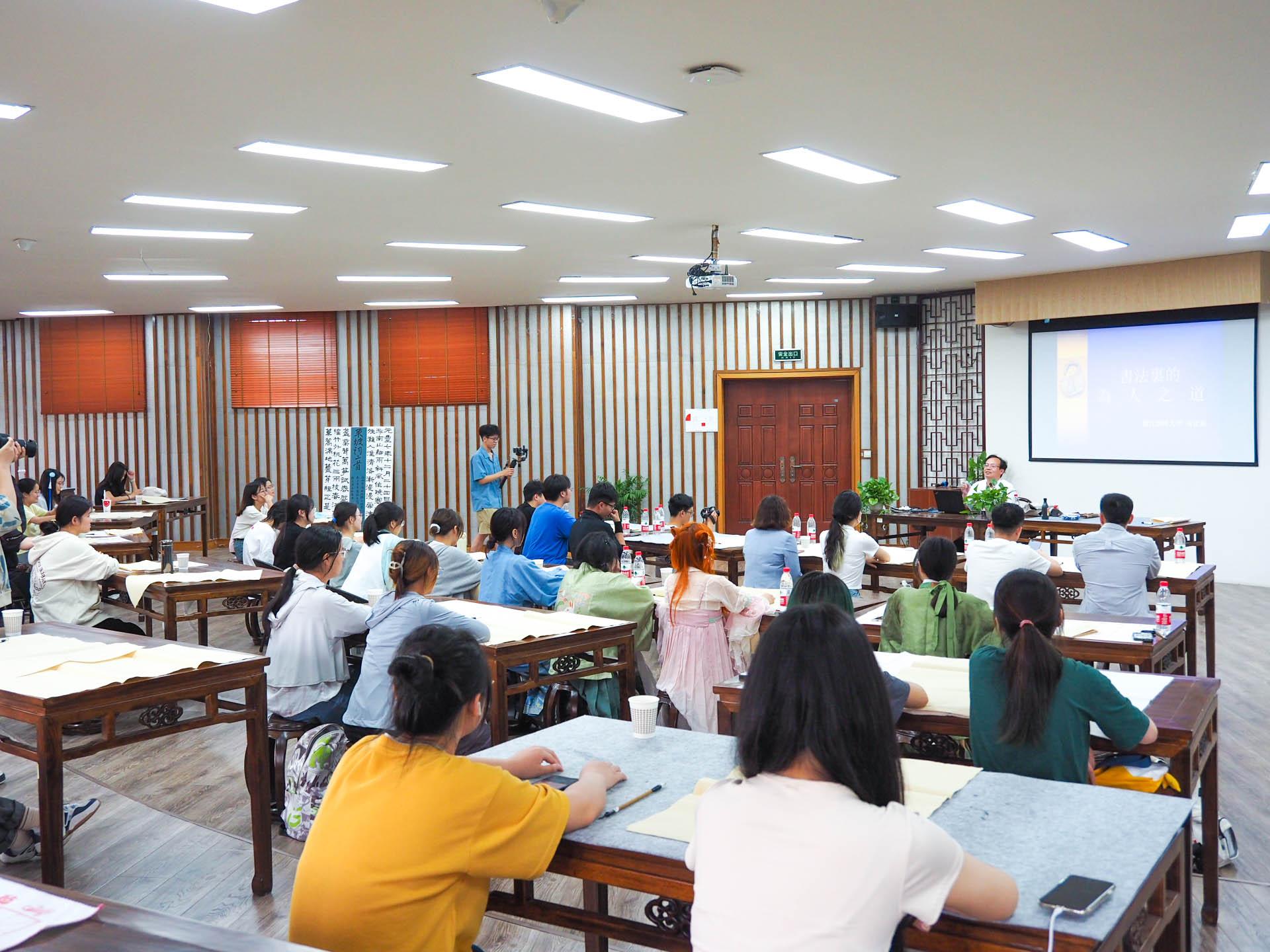 黄建新老师以《书法里的为人之道》为题,通过“中国书法的特点”“中国书法的为人之道”以及“提高书法水平之方法”三部分,为同学们讲述了中国书法文化蕴含的独特魅力。书法是中华传统文化的瑰宝,历史悠久、博大精深,是世界上最具民族特色的文字、最美的文字。黄建新老师和同学们分享了他的习书经历,阐释了书法所蕴含的辩证关系和做人道理。他希望同学们通过学习书法、练习书法提高审美能力,浸润心灵,以美化人,从而发现美、欣赏美,创造美,在学习书法中学会为人处世。