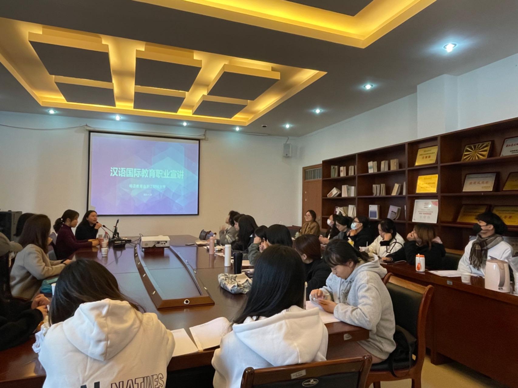 杭州畅语教育咨询有限公司成立于2015年,在2023年与公司合作共建“汉语国际教育专硕实践基地”。本次宣讲暨招聘会的开展,既贴合公司专业,让同学们切实的了解到目前对外汉语教师这一行业所处的国际环境,同时也给予了有志于对外汉语教师这一行业的同学们一个更广阔的舞台,让他们能充分发挥自身专业特色,找到专业对口的工作。接下来公司将持续做好“访企拓岗”,努力为毕业生拓宽就业渠道,提供就业指导,力促2024届毕业生实现更充分、更全面、更高质量就业。