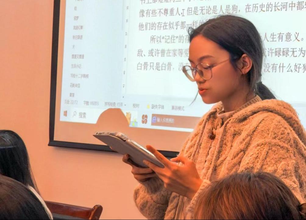 在个人发言环节,同学们踊跃参与,各抒己见。吴师羽同学感叹道:“闭门造车闷着头自顾自写东西总感觉还是少点意思,能有这么一次交流活动感觉一方面也能透过文章看到大家的个性,就像又见了大家一面和大家跨越纸张聊天一样,另外一方面,百家之言也对于自身写作也有蛮大帮助的。”新加入班级的安可、王绿筠、季语桐、项塍筱四位同学也借此机会表达了对加入23文学3班大家庭的喜悦。