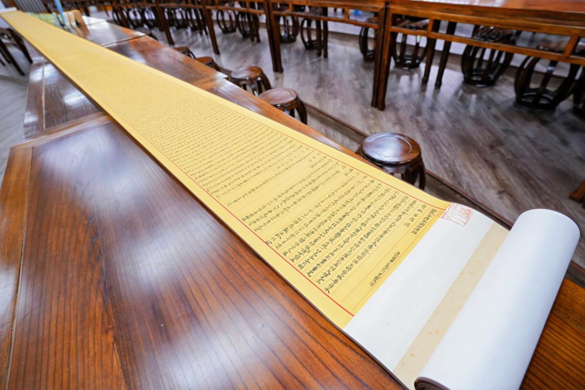 走进问津书院,墙面挂着20余件各种书体的书法立轴,木桌上陈列着篆刻文献、扇面、传统与现代印章,14米的书法长卷铺满了长桌。