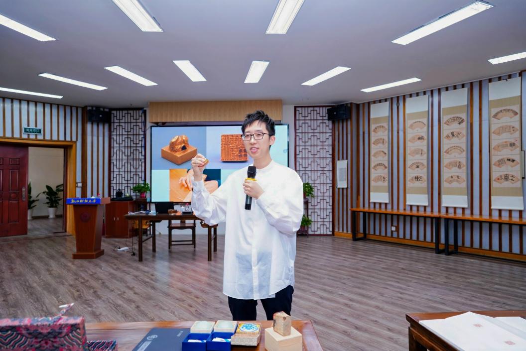 青年书法家黄杨围绕篆刻小史和展品进行细致讲解和导览,并带领师生操刀制印。刀锋在印石上轻轻游走,每一刀都精准而有力,一方精美的印章便呈现在众人眼前。