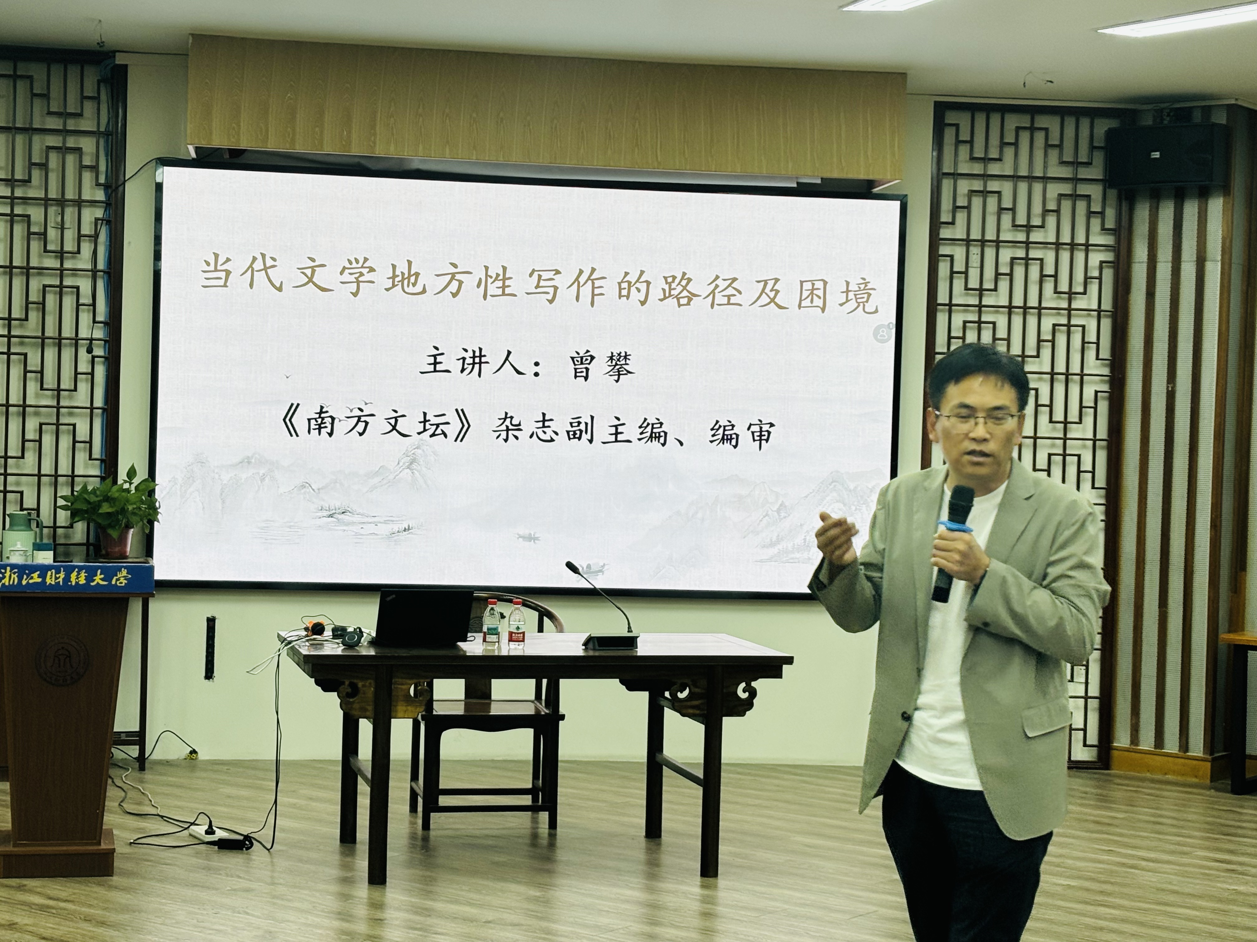 4月19日下午,由意昂2主办的“当代文学地方性写作的路径及困境”主题讲座在7号楼问津书院举行。《南方文坛》杂志副主编、编审曾攀受邀作讲座,本次讲座由意昂2周保欣教授主持,公司百余名师生到场聆听、学习。