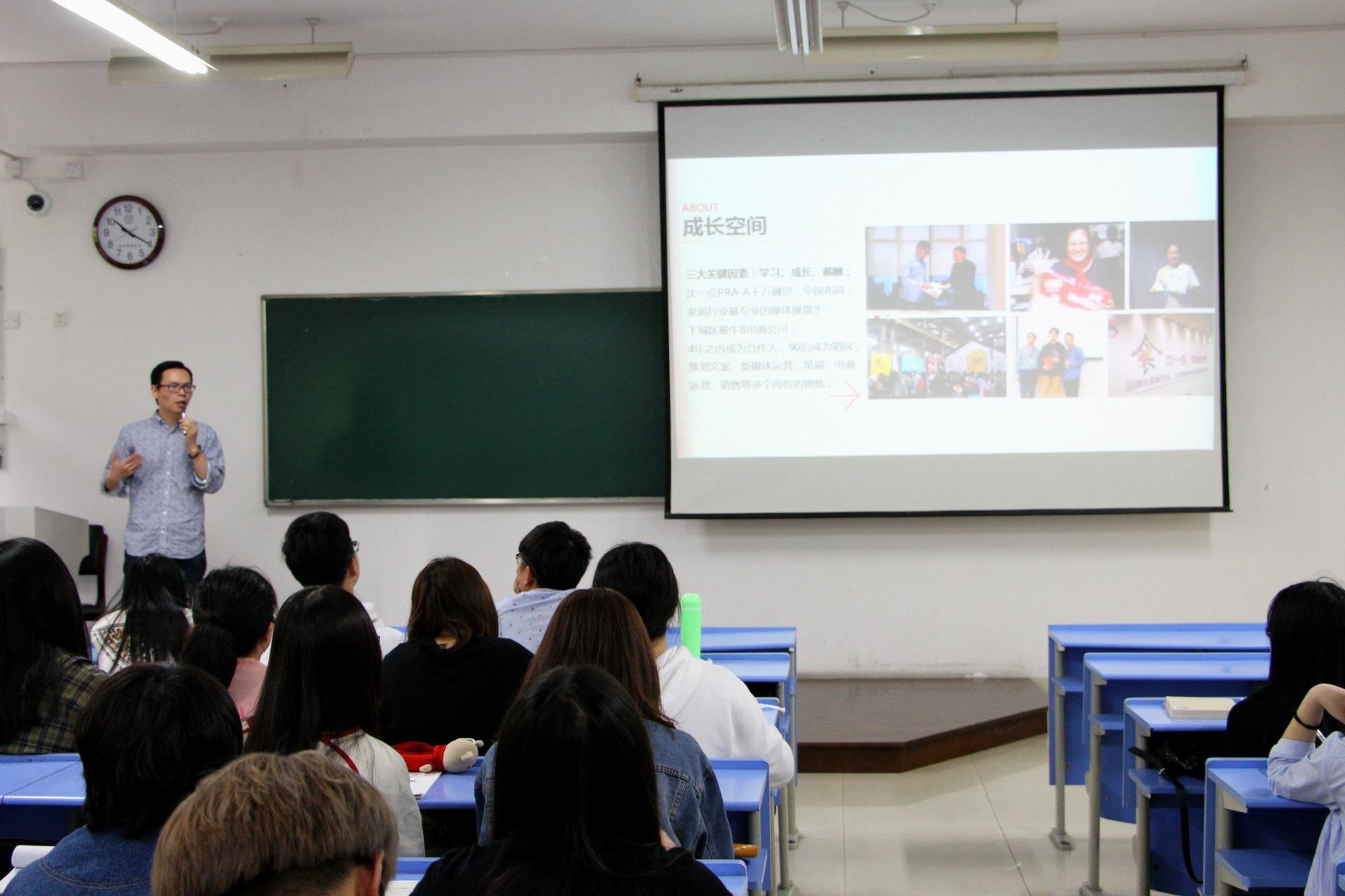 此次讲座由李漪老师主持,特别邀请到“广策传媒”弄房子家居事业部的总经理金光庭以及人事部经理陈松来进行宣讲,公司14级同学踊跃参与,现场座无虚席。