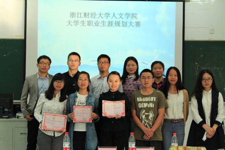 讲话结束后是大赛最期待的颁奖环节。“严云、盛雨薇、向天琦分别获得职业规划类一、二、三等奖,项军海、蔡雅茹、陈阳分别获得了创业规划类一、二、三等奖。最后,选手与评委拍照留影,本次大赛圆满结束。