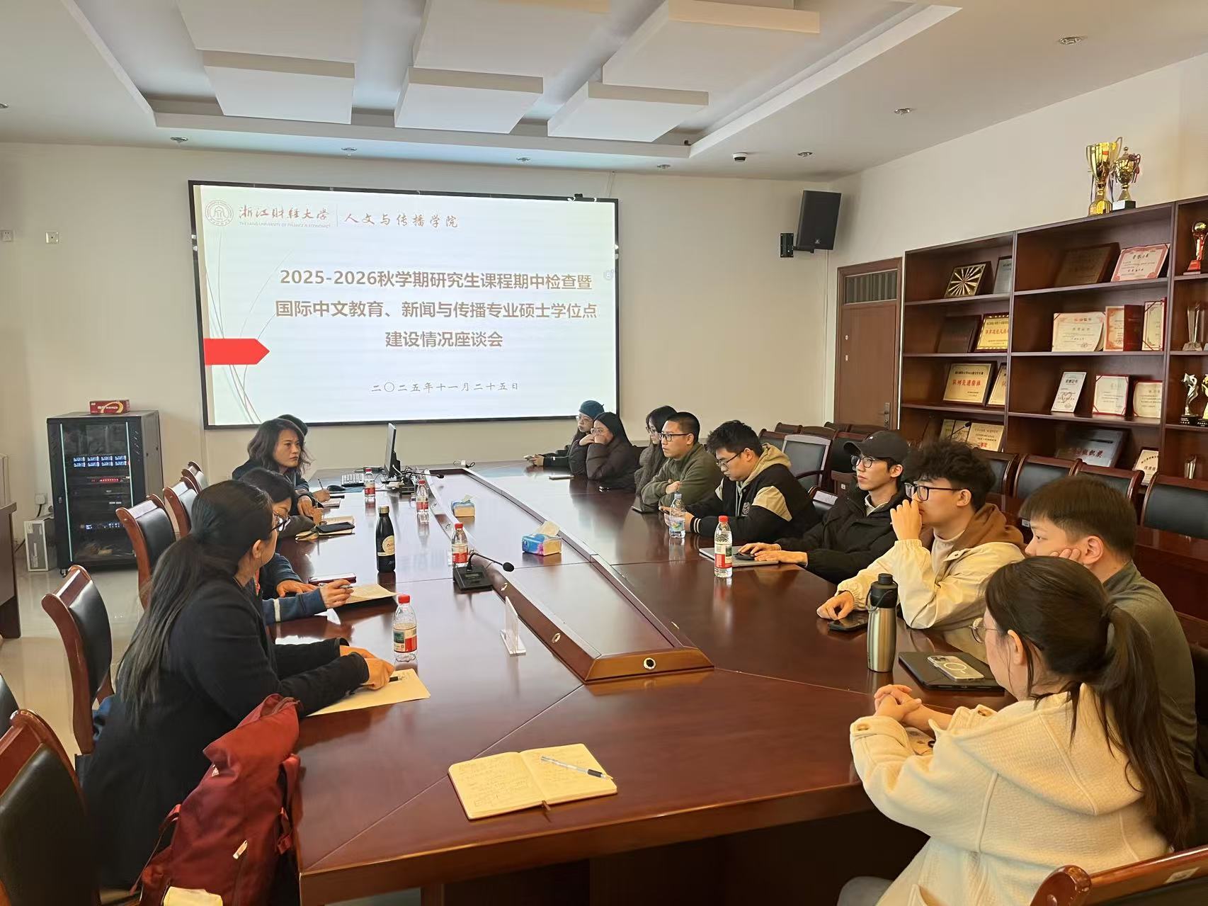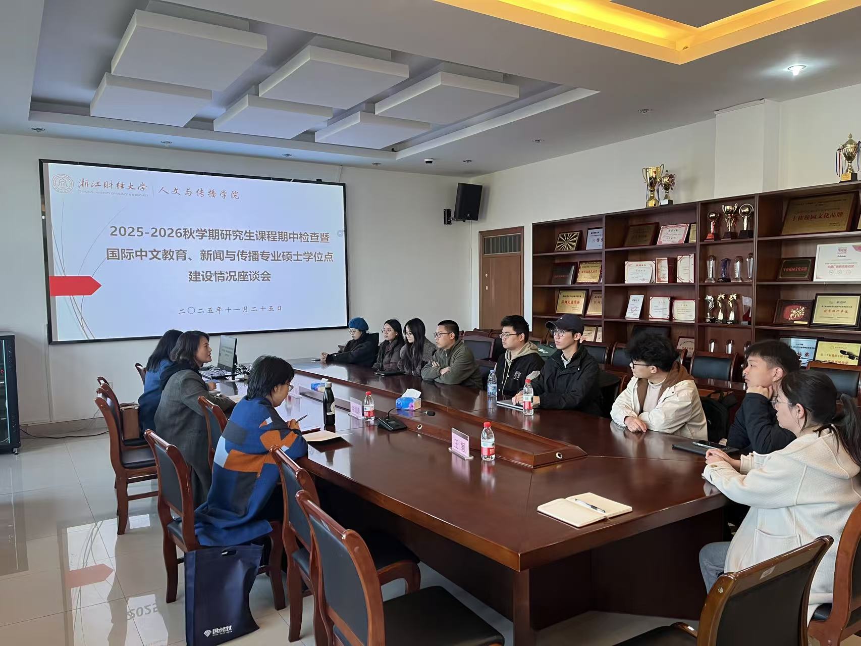 根据公司2025-2026学年秋学期研究生课程期中考核和教学检查的工作安排,公司于11月25日下午16:00在公司楼404会议室召开本学期的研究生座谈会。本次座谈会邀请到了研究生院督导余清萍教授,公司分管领导毋丹副经理参加并主持本次座谈会,国际中文教育负责人付伊副教授、新闻与传播专业硕导王颖副教授、研究生秘书以及公司24、25级各专业研究生代表20余人参加了座谈会。